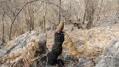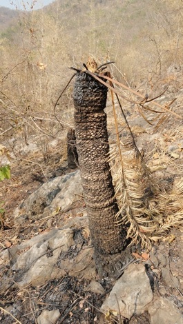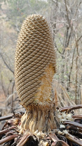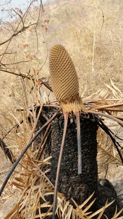 Cykas s kmenem dorůstajícím 5 metrů výšky a tmavě hnědou kůrou. Na vrcholu kmene a listech lze najít podobné chlupy typické pro druh Cycas siamensis ale šištice i samičí plodolisty jsou podobnější druhu Cycas clivicola.