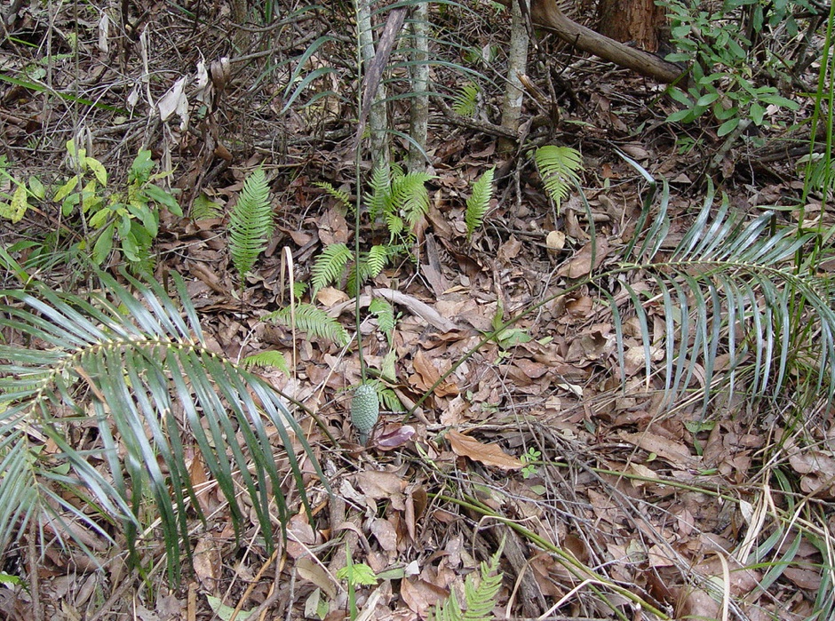 Malý cykas s podzemním kmenem v průměru do 20cm a bílými tvrdými bázemi vysoce lesklých lístků.